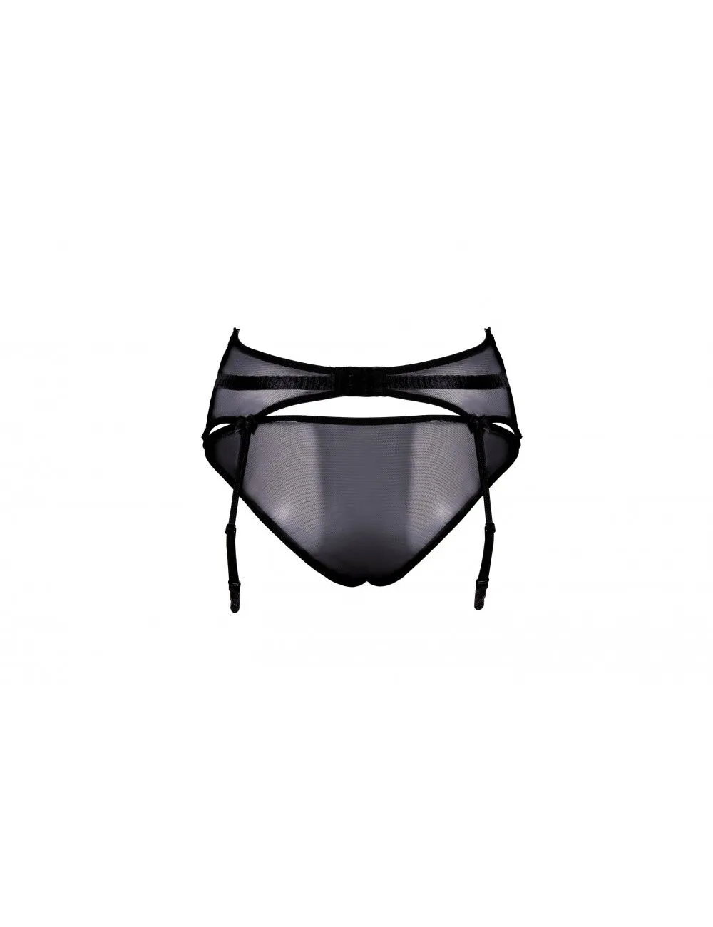 Culotte échancrée confectionnée de dentelle avec motif sur l’avant et de voile transparent sur le dos.