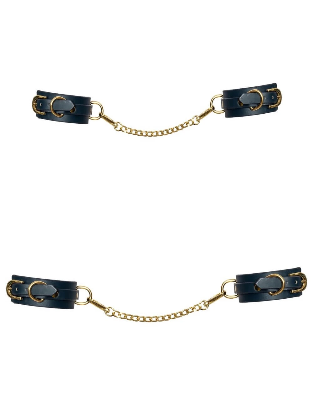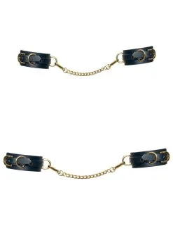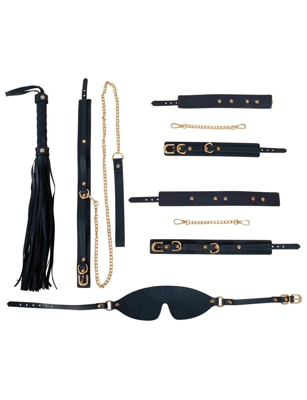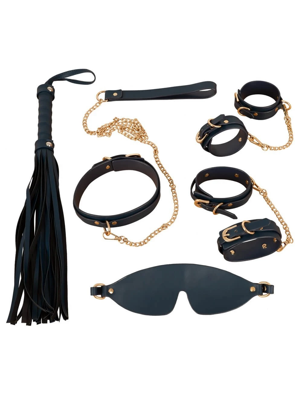 Ensemble de bondage 6 pièces de haute qualité de Bad Kitty dans un aspect cuir élégant et une palette de couleurs élégantes : bleu foncé avec des détails en métal doré.