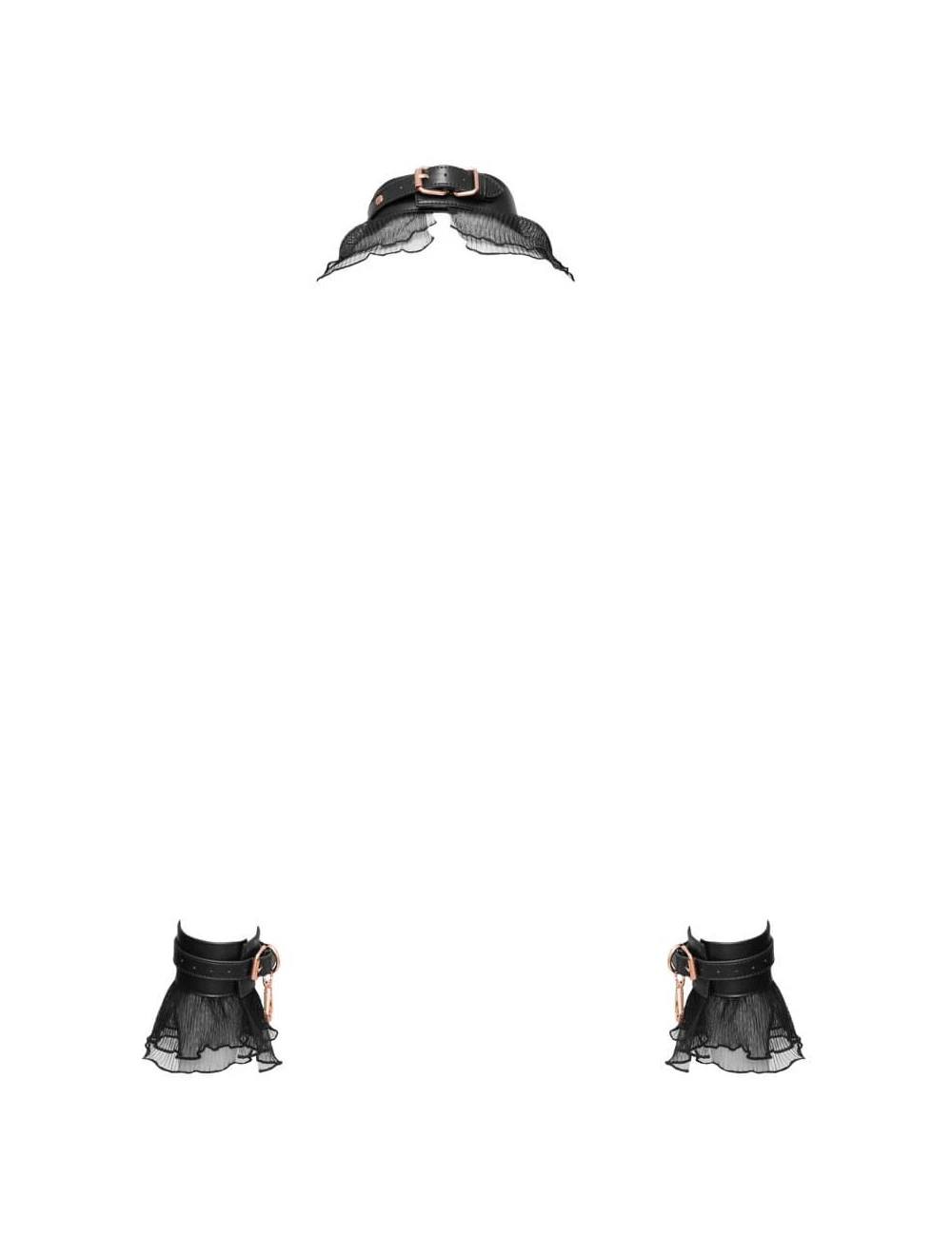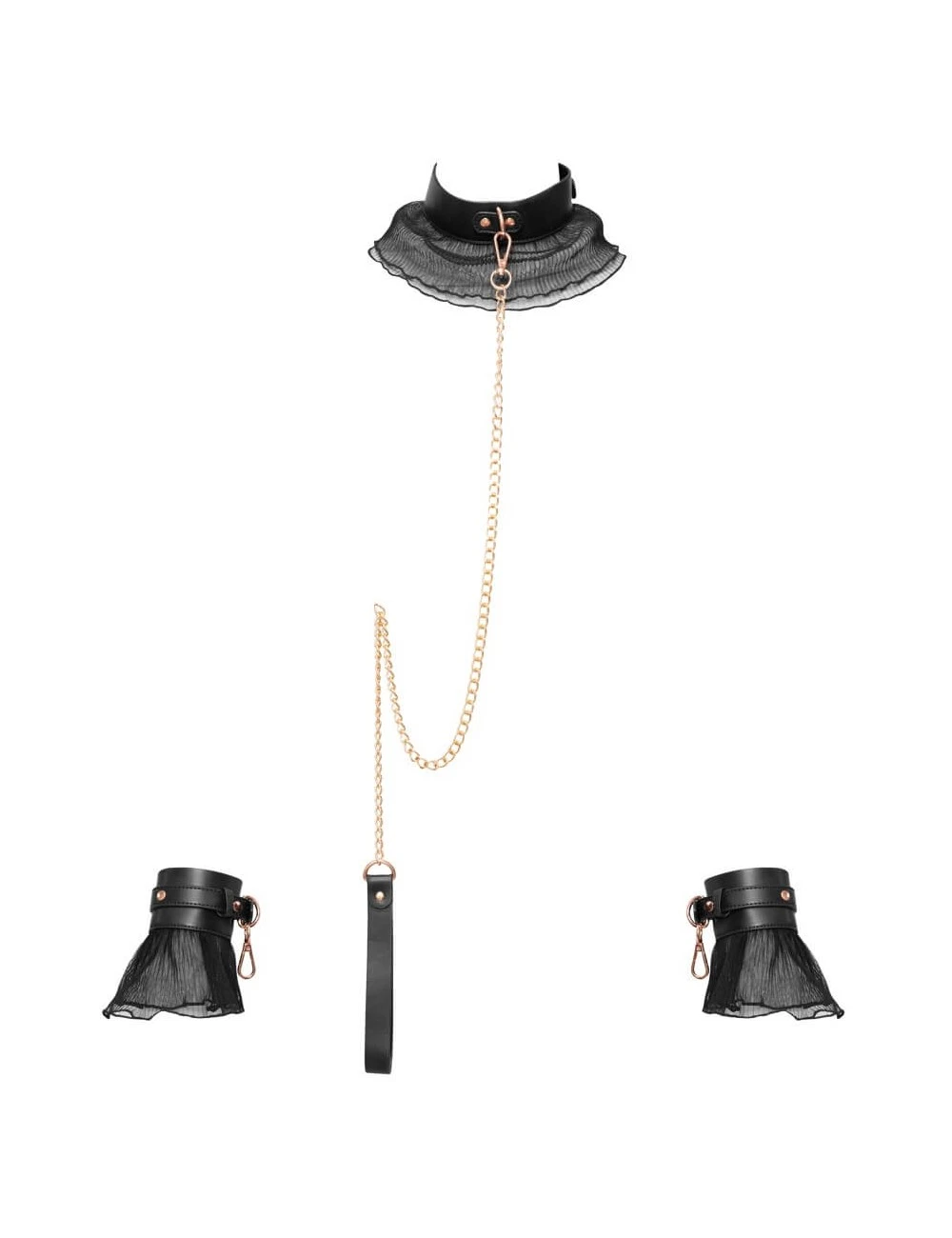 Chaque menotte a un anneau et un mousqueton. Le collier avec un anneau a une laisse en chaîne amovible avec un mousqueton et une boucle pour la main.