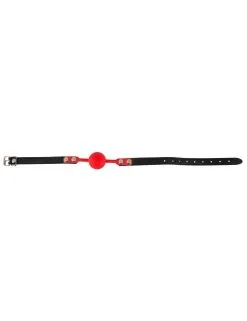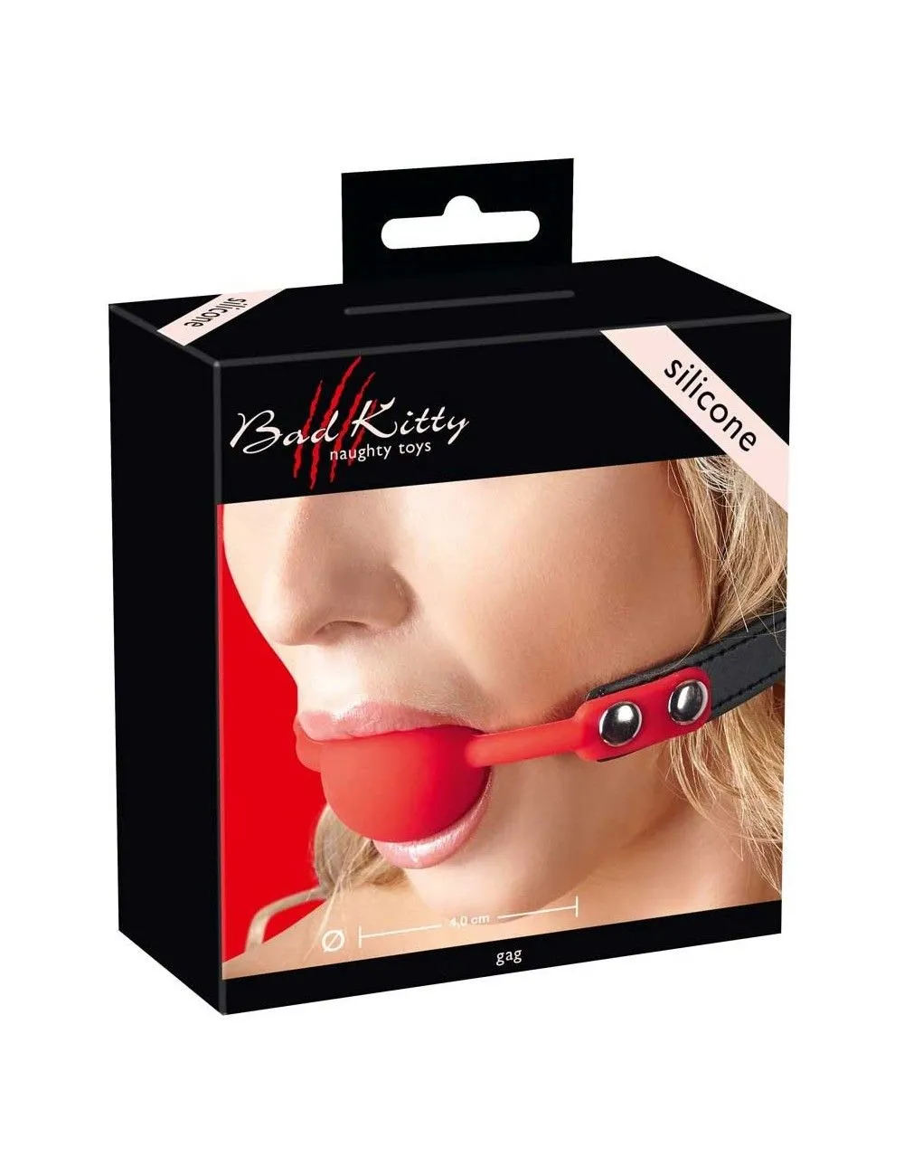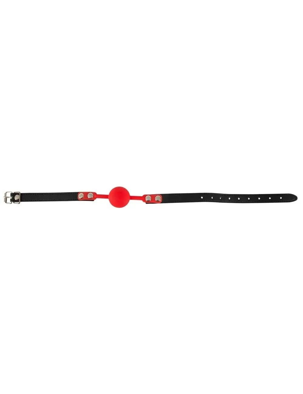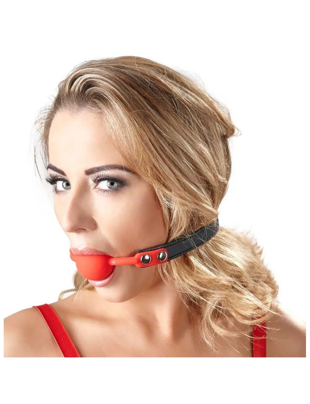 Boule rouge d’environ 4 cm de diamètre fait en silicone souple et agrĂ©able Ă placer dans la bouche.