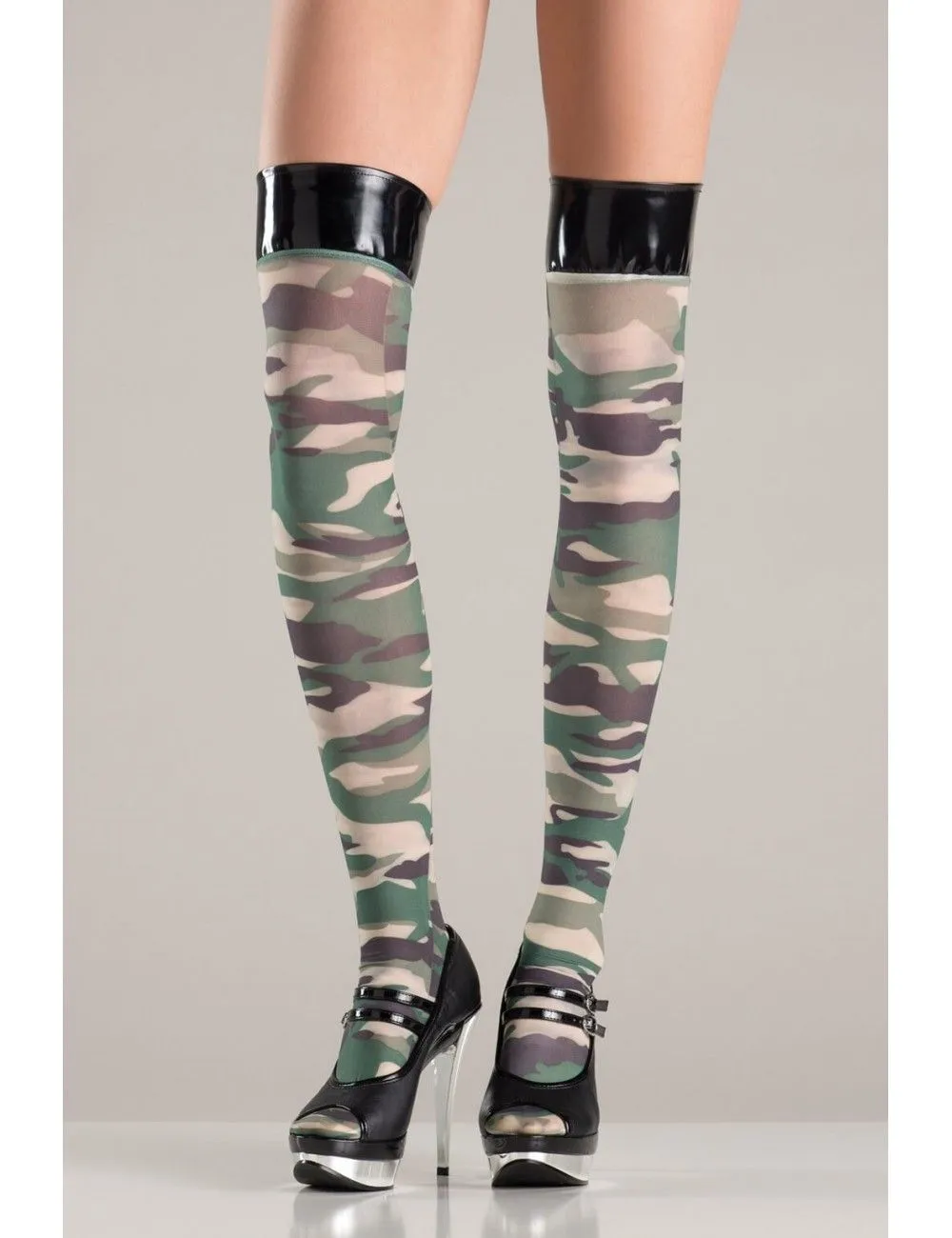 Bas camouflage légèrement transparent avec une jarretière en vinyle noir.