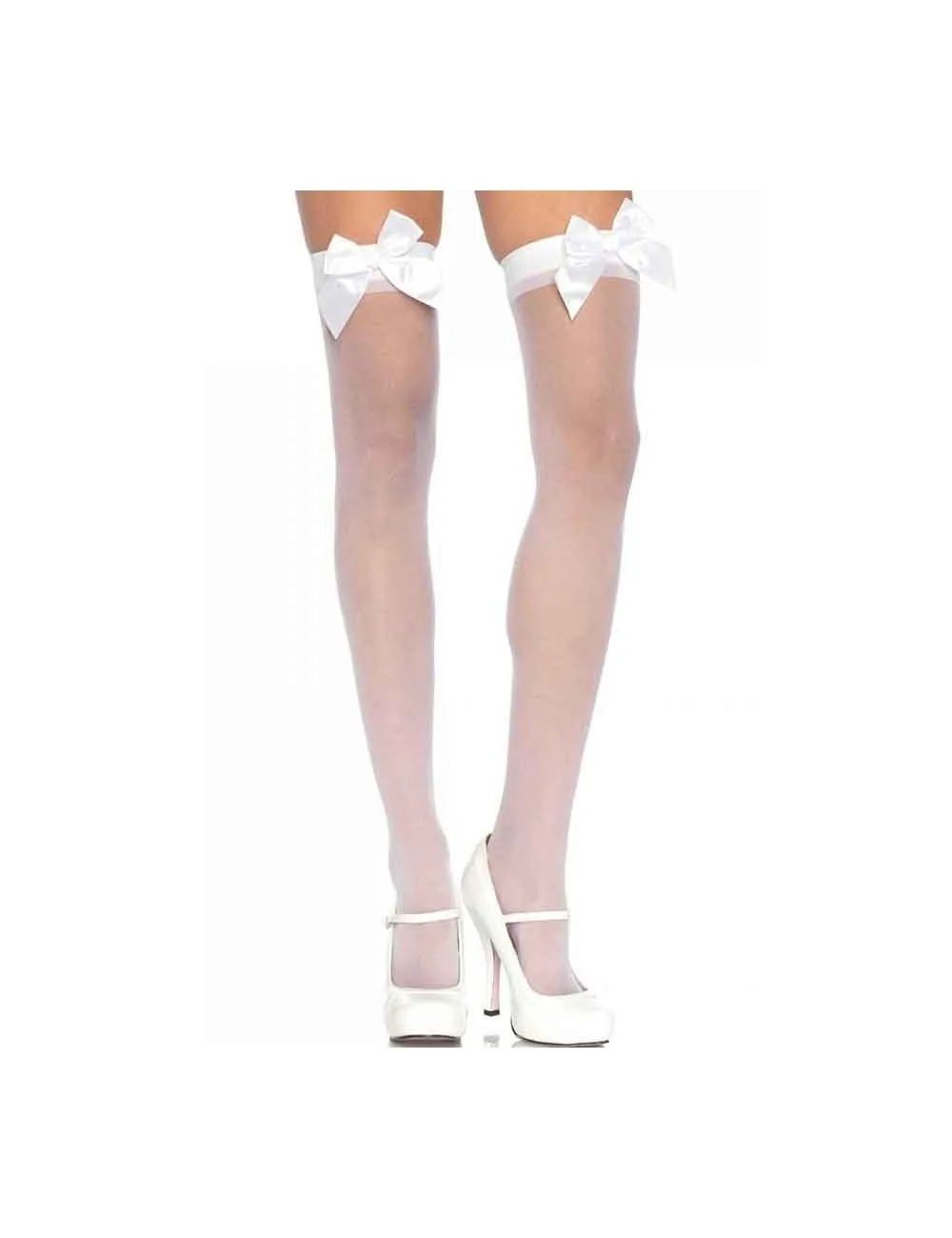 Paire de bas en voile transparent fin avec jarretelle Ă©lastique et gros noeud satinĂ© blanc sur l’avant.