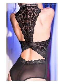 Body noir avec empiècements de dentelle transparente avec motifs et fine résille, confection bi matière.