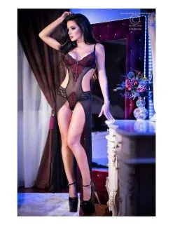 Body en dentelle et résille transparente noire et rouge avec une longue traine.