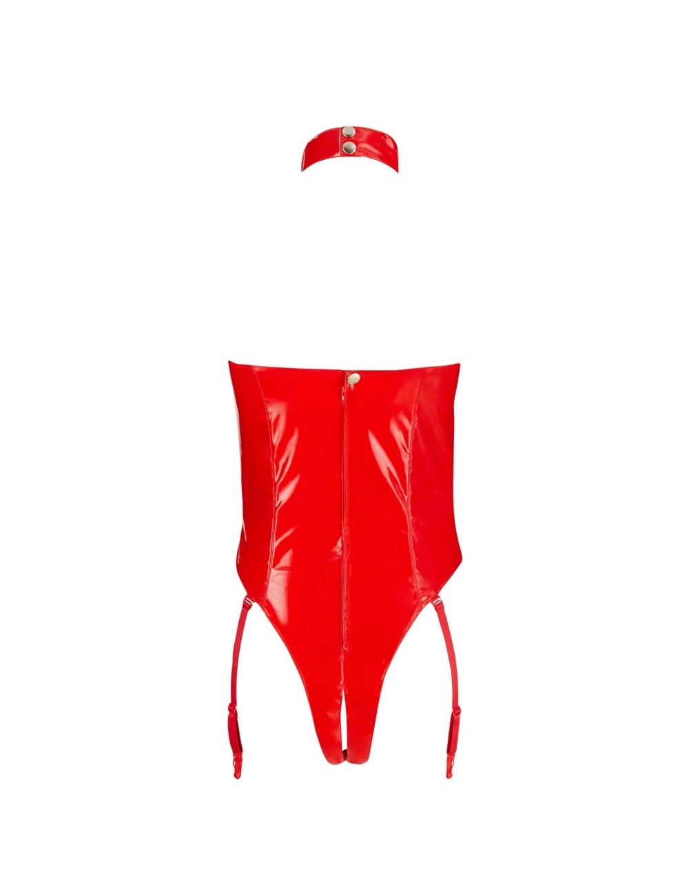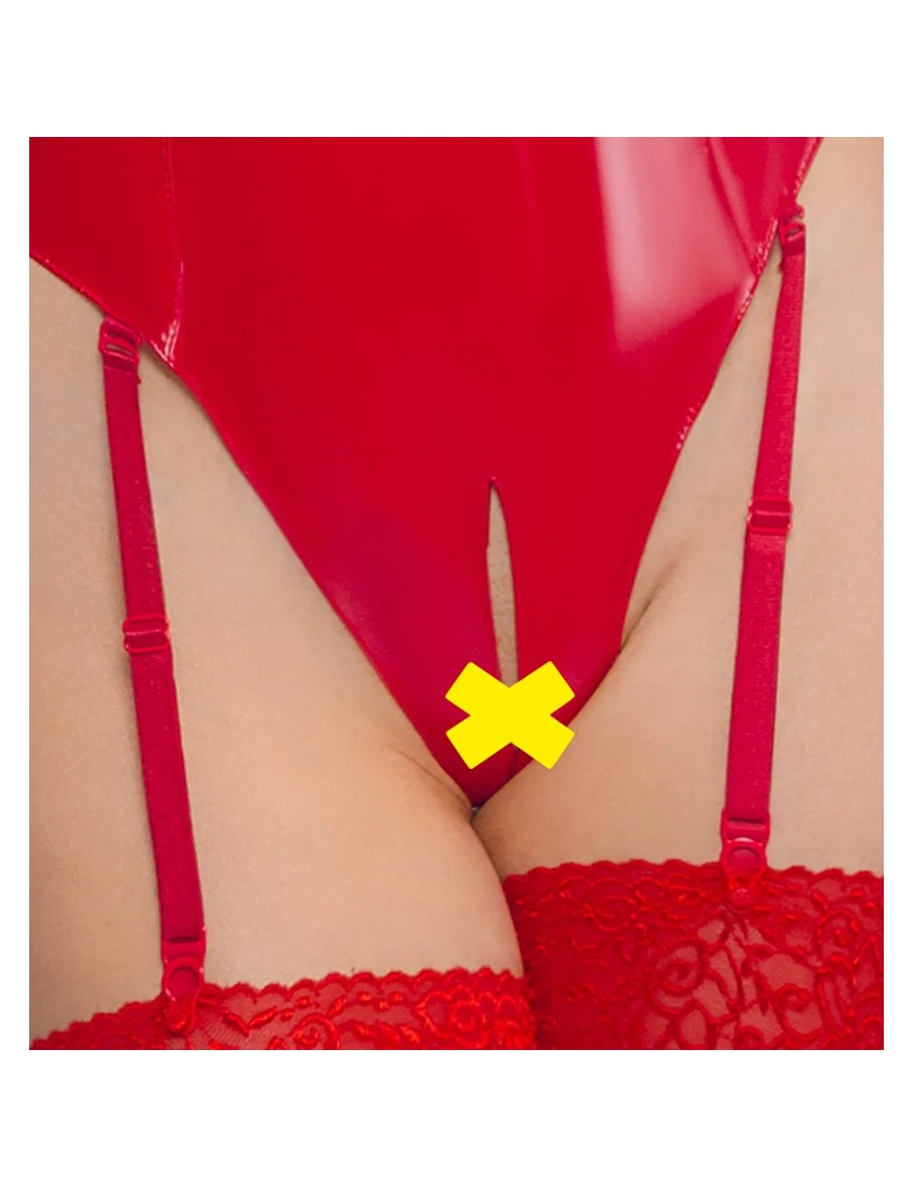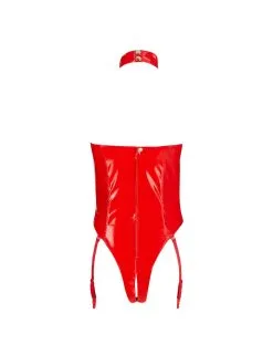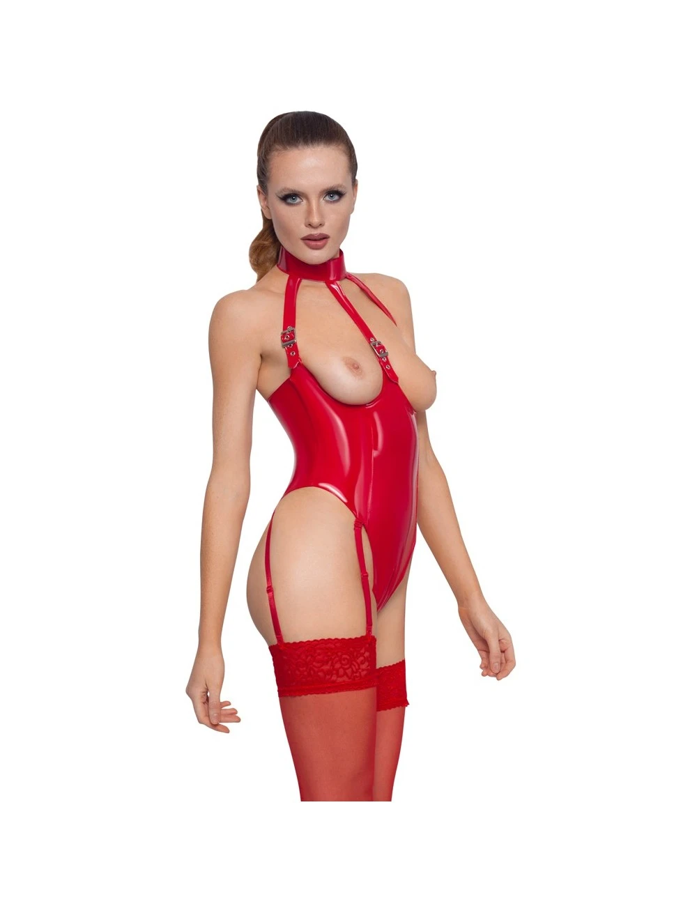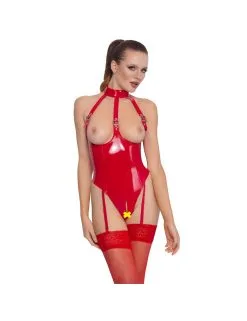Body érotique en vinyle rouge avec larges ouvertures sur la poitrine.