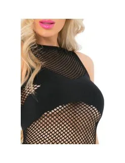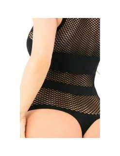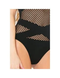 Ornez votre corps avec ce body résille et bandes noir jouant de tissu opaque et résille