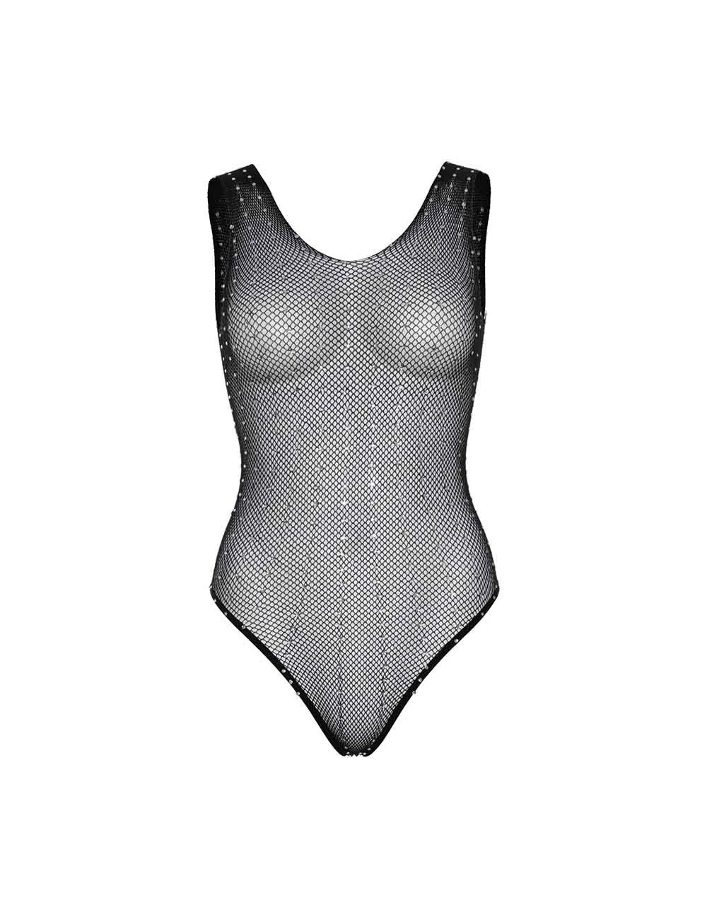 Un body transparent confectionné de résille avec un quadrillage fin et des strass parsemés apportent une touche brillante.
