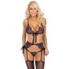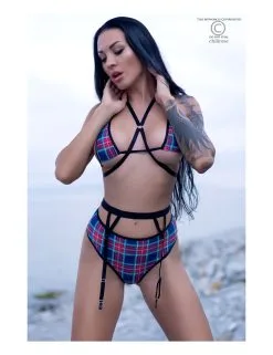 Une lingerie composée d’un soutien-gorge et d’une culotte haute échancrée avec harnais de poitrine, porte-jarretelles et paire de bas.