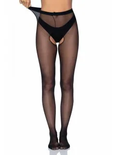 Collant de sĂ©duction noir transparent en voile fin et ouvert Ă l’entrejambes.