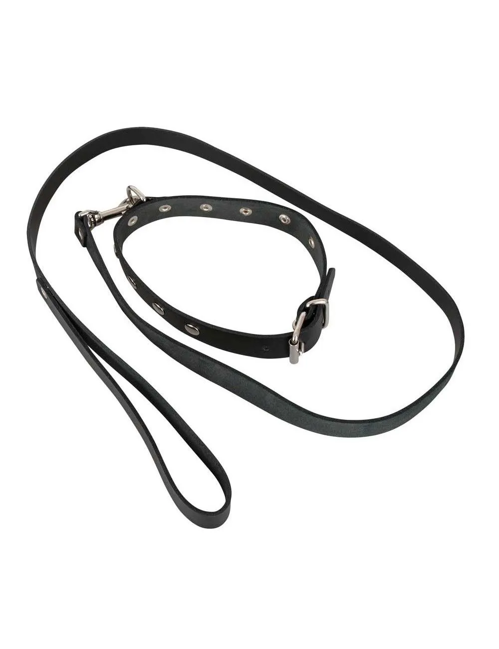 Collier étroit en cuir noir clouté et laisse de 90 cm de long.