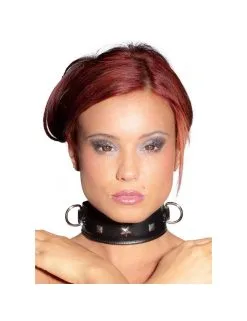 Collier en cuir noir double couche avec anneaux et clous décoratifs.