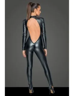 Combinaison vinyle avec un décolleté profond dans le dos.