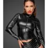 Combinaison en vinyle noir brillant et manches longues boutonnĂ©e de l’entrejambe jusqu’au col.