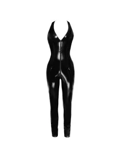 Combinaison en vinyle noir brillante avec zip de fermeture au niveau de l’entre jambe fonctionnant dans les deux sens.