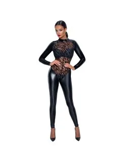 Combinaison à manches longues en vinyle avec des inserts en fine résille sur le décolleté avec un motif floqué ambiance tigre.