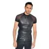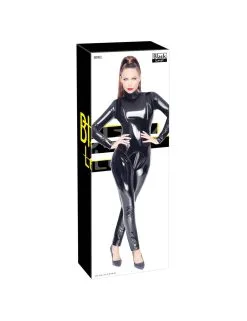 Combinaison catsuit en vinyle noir brillant moulant et très extensible.