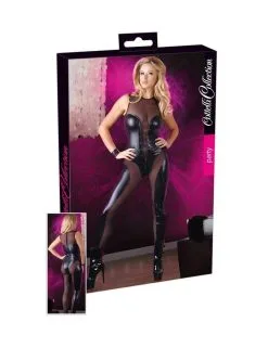 Combinaison wetlook noir avec résille transparente sans manches.