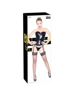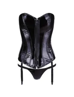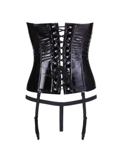 Corset en vinyle noir brillant avec porte-jarretelles réglables et amovibles.