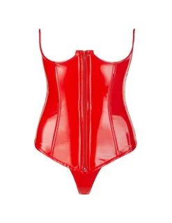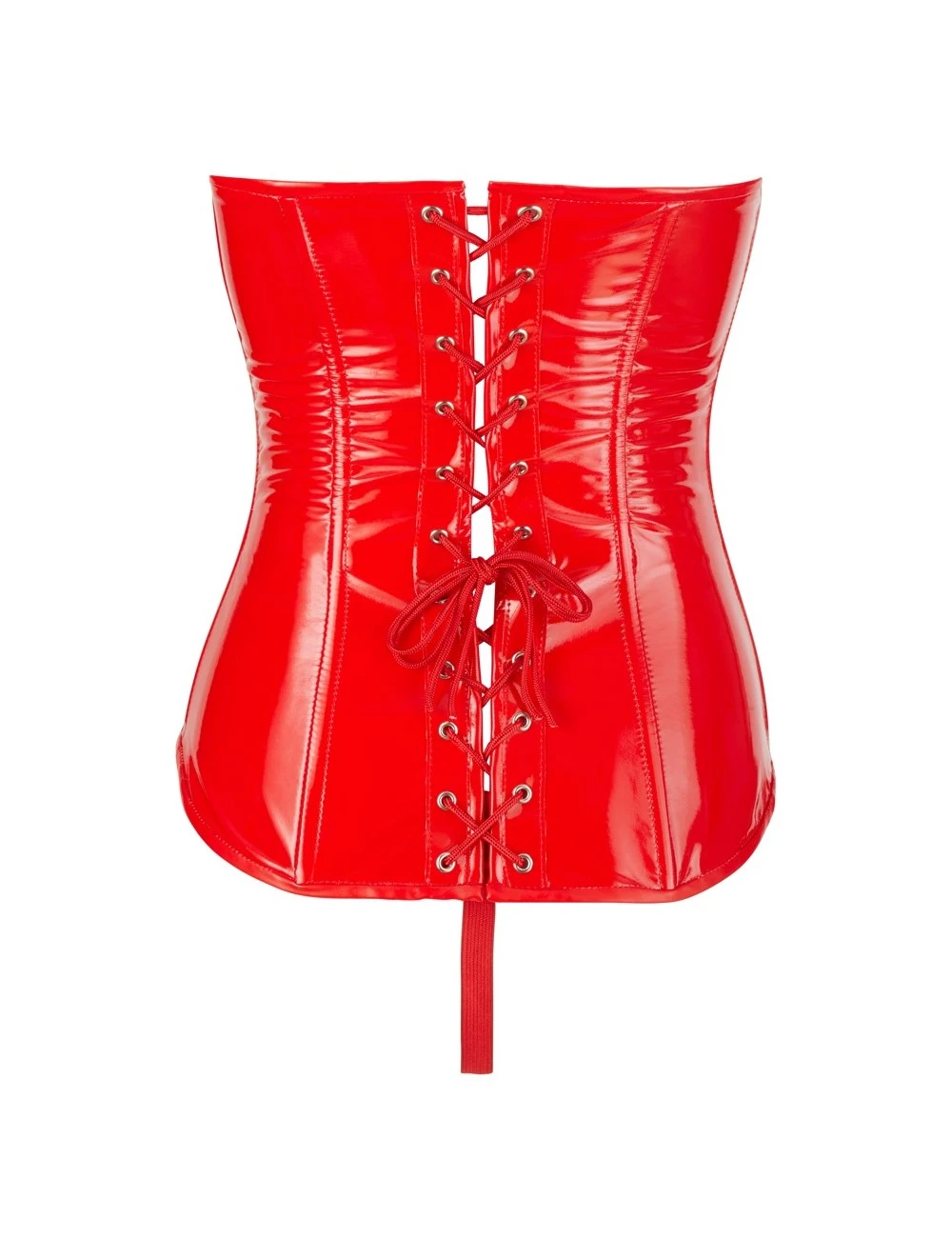 Corset en vinyle rouge brillant Ă bonnets ouverts avec armatures.