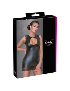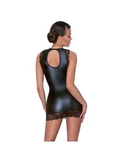 Robe courte aspect noir mat cintrée à la taille avec une dentelle délicate autour des bras et sur le bas de la robe.