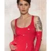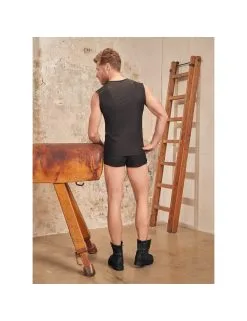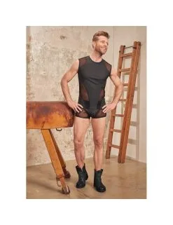 Débardeur noir sans manches fabriquée dans un matériau d’aspect mat accentué avec des inserts en filet transparent de chaque côté à l’avant et sur le devant des épaules.