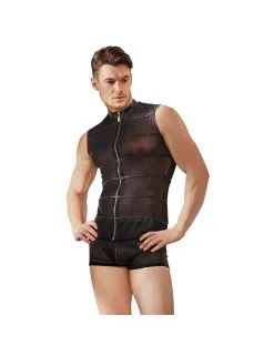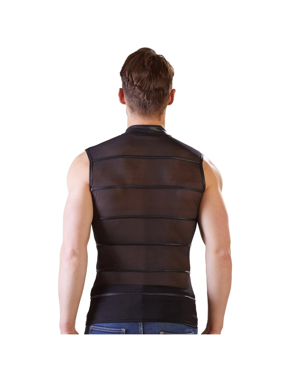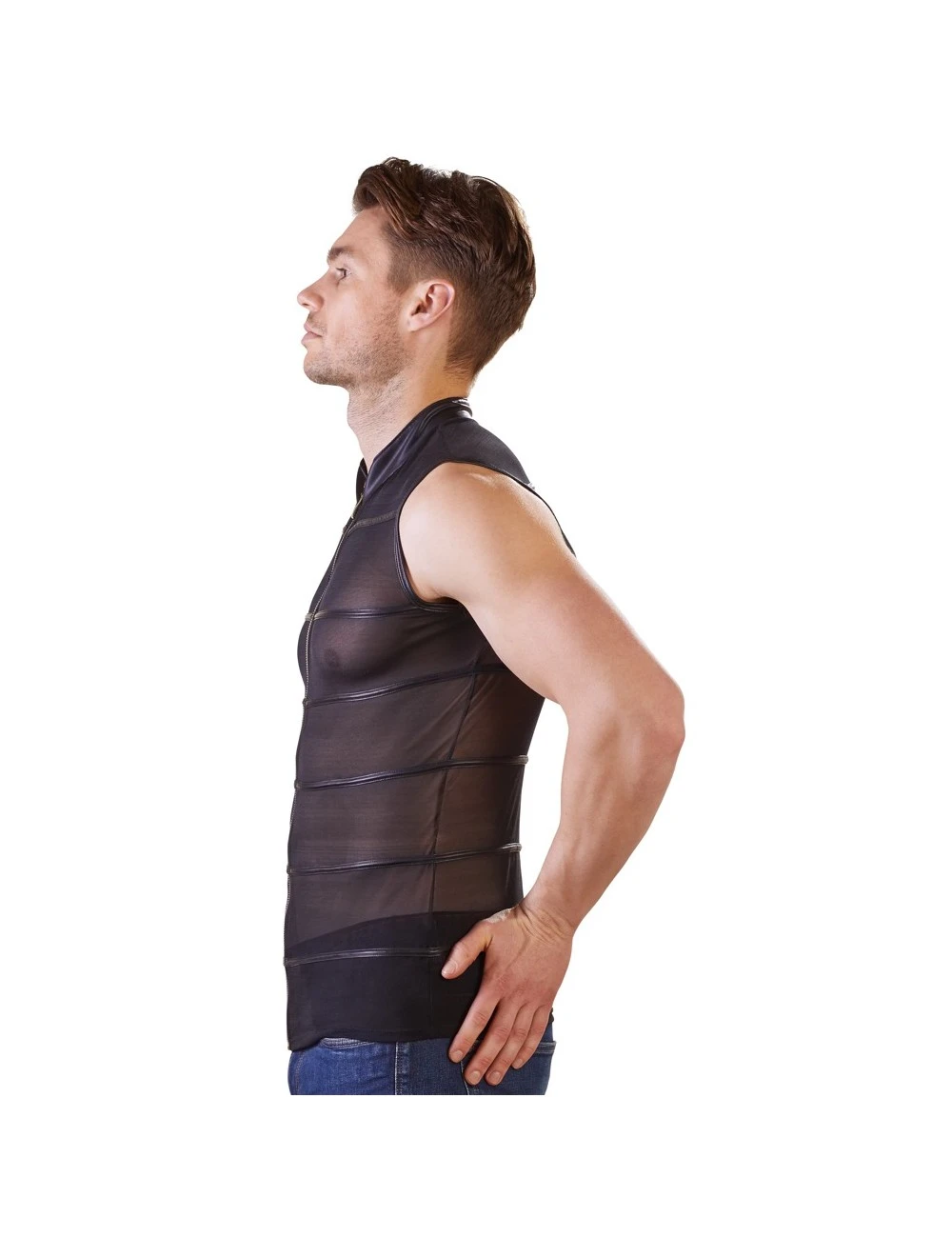 Le matériau transparent est divisé par des rayures noires mates qui ajoutent une touche excitante au débardeur. Matière stretch pour un meilleur confort. Le col montant possède un zip intégral sur le devant…