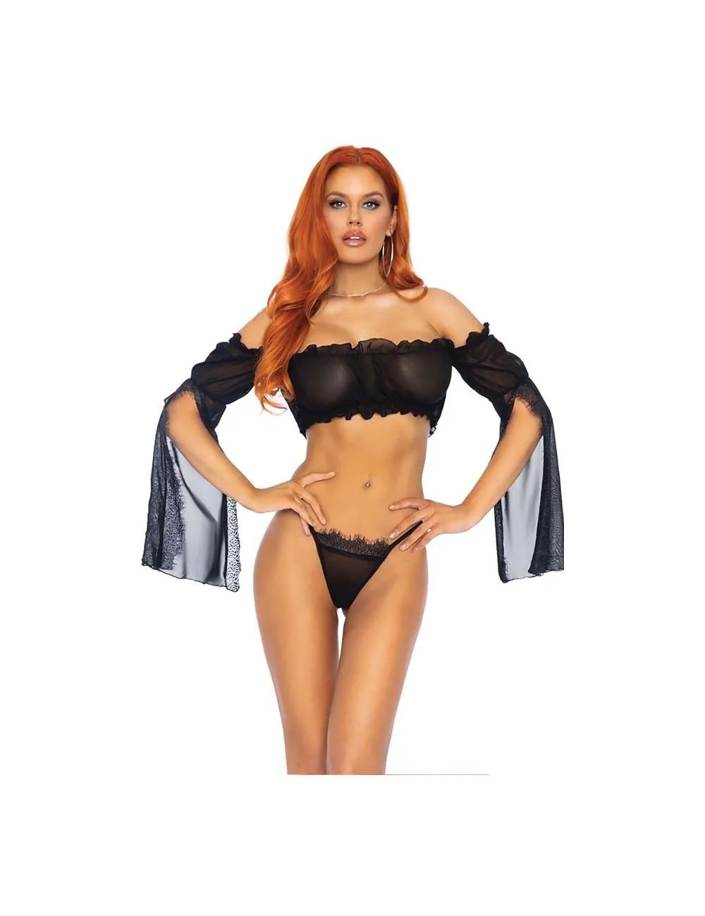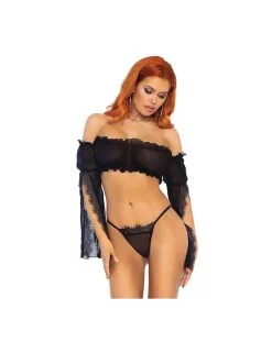 Ensemble 2 pièces en voile semi-transparent. Top bandeau avec manches longues et évasées qui se porte sur les bras, laissant le haut du dos nu et les épaules dégagées. String ficelle assorti.