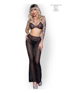 Le haut du pantalon est marqué d’une ceinture noire en dentelle et la partie arrière à une coupe décorative avec un élément de bijouterie.