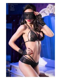 Un bandeau pour les yeux en dentelle finalise ce modèle.