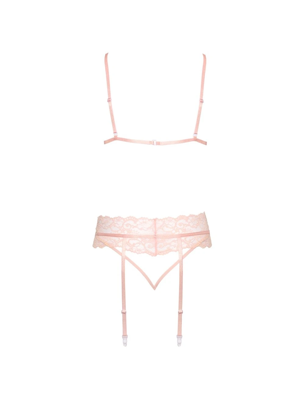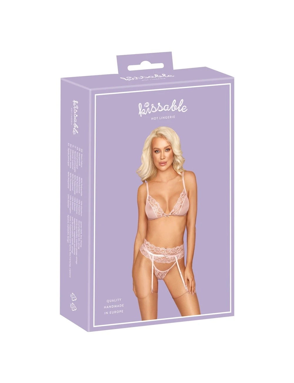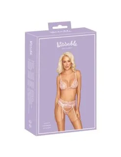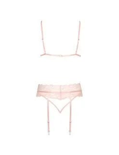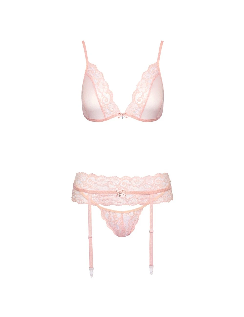 3 pièces de sensualité et de douceur sur la peau avec cet ensemble fin en lingerie confectionné de dentelle rose clair et paré de motifs floraux.