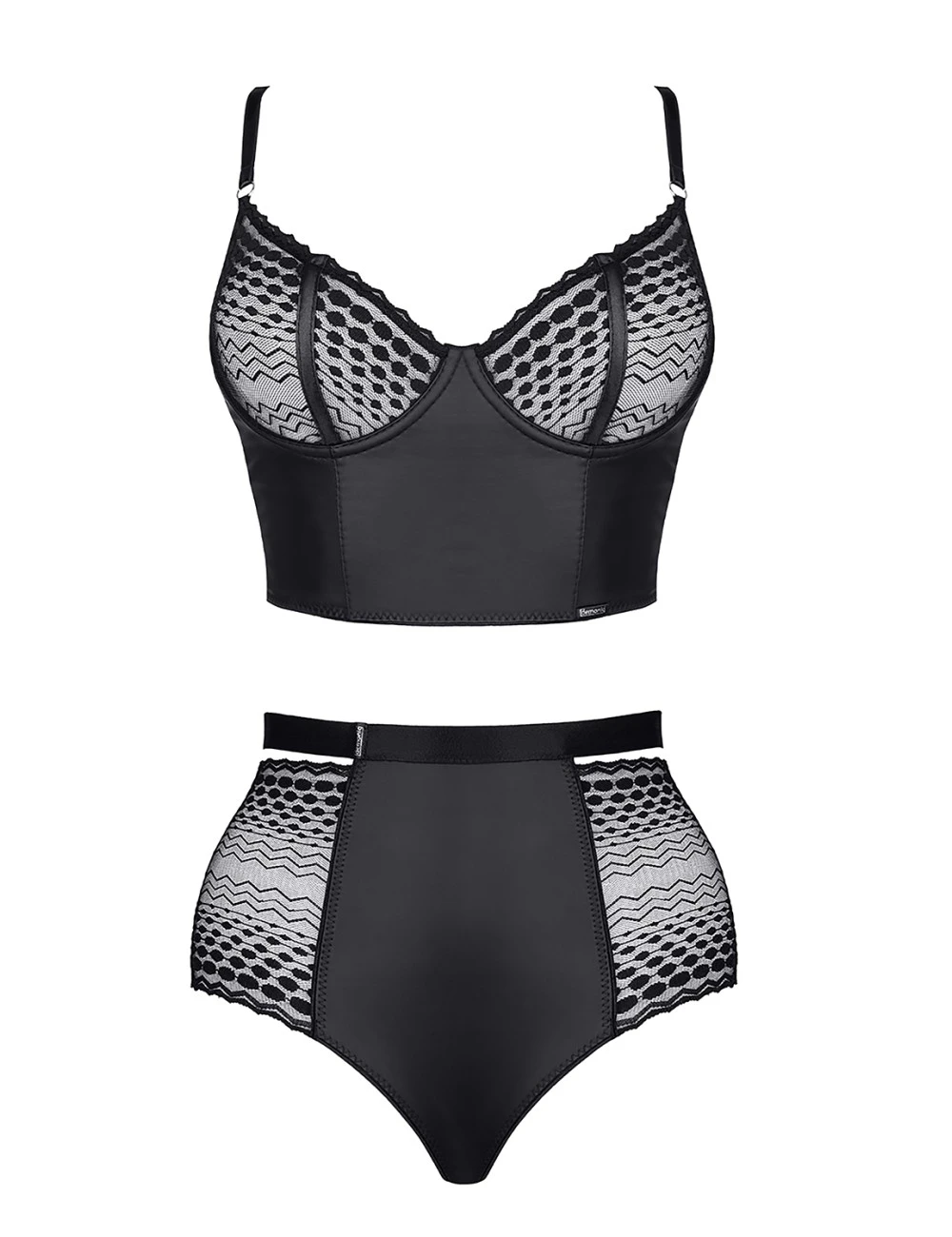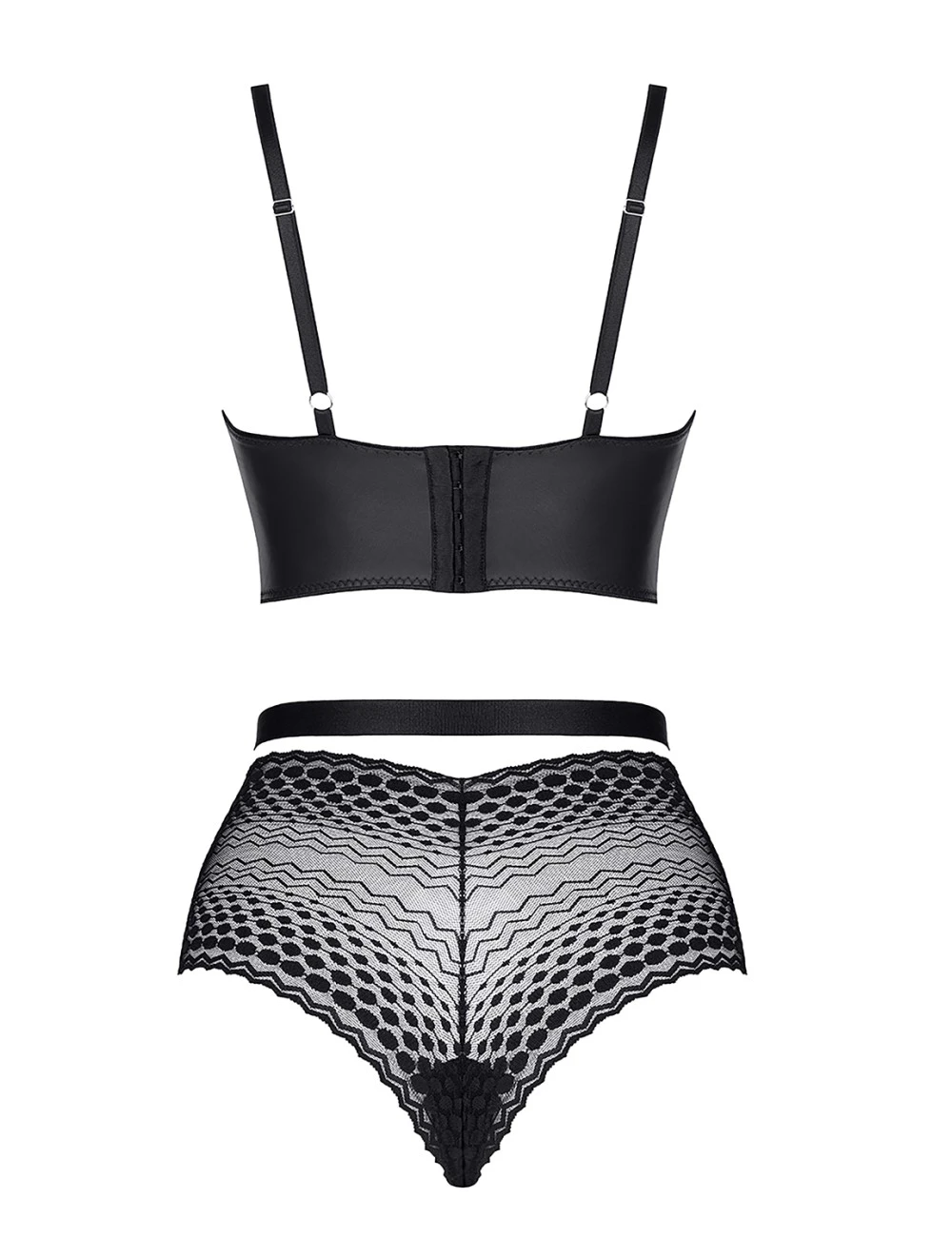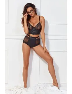 Le soutien-gorge sĂ©duit par l’association efficace de la dentelle gĂ©omĂ©trique noire et du wetlook mat.