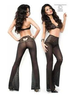 – Pantalon moulant et évasé sur le bas. Au dos ouverture en forme de coeur doté d’un bijoux strass