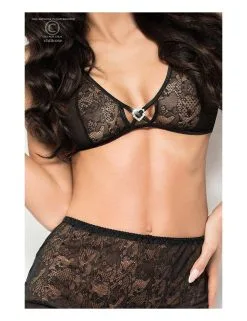 – Soutien-gorge sans armatures avec voile et dentelle semi-transparente. Croisé entre les seins avec bijou en forme de coeur et strass