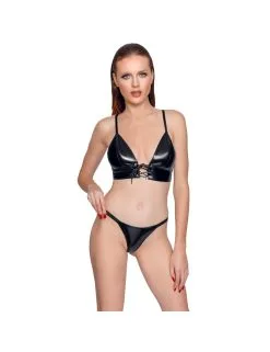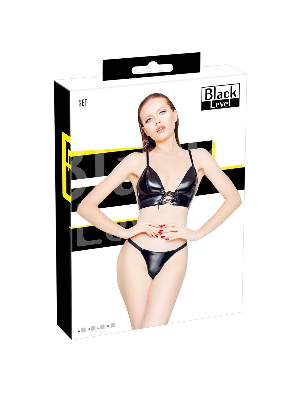 Ensemble de Black Level composĂ© d’un soutien-gorge et d’un string en laque noire brillante.