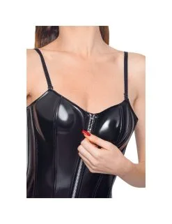 Guêpière en vinyle noir brillant avec laçage dans le dos.