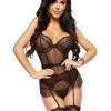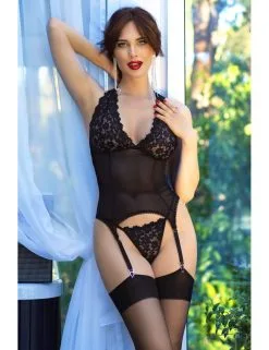 Guêpière noire élégante dans un mélange de fine résille et de dentelle florale.