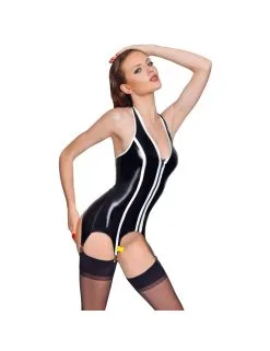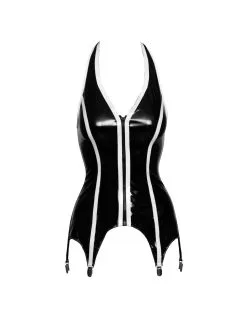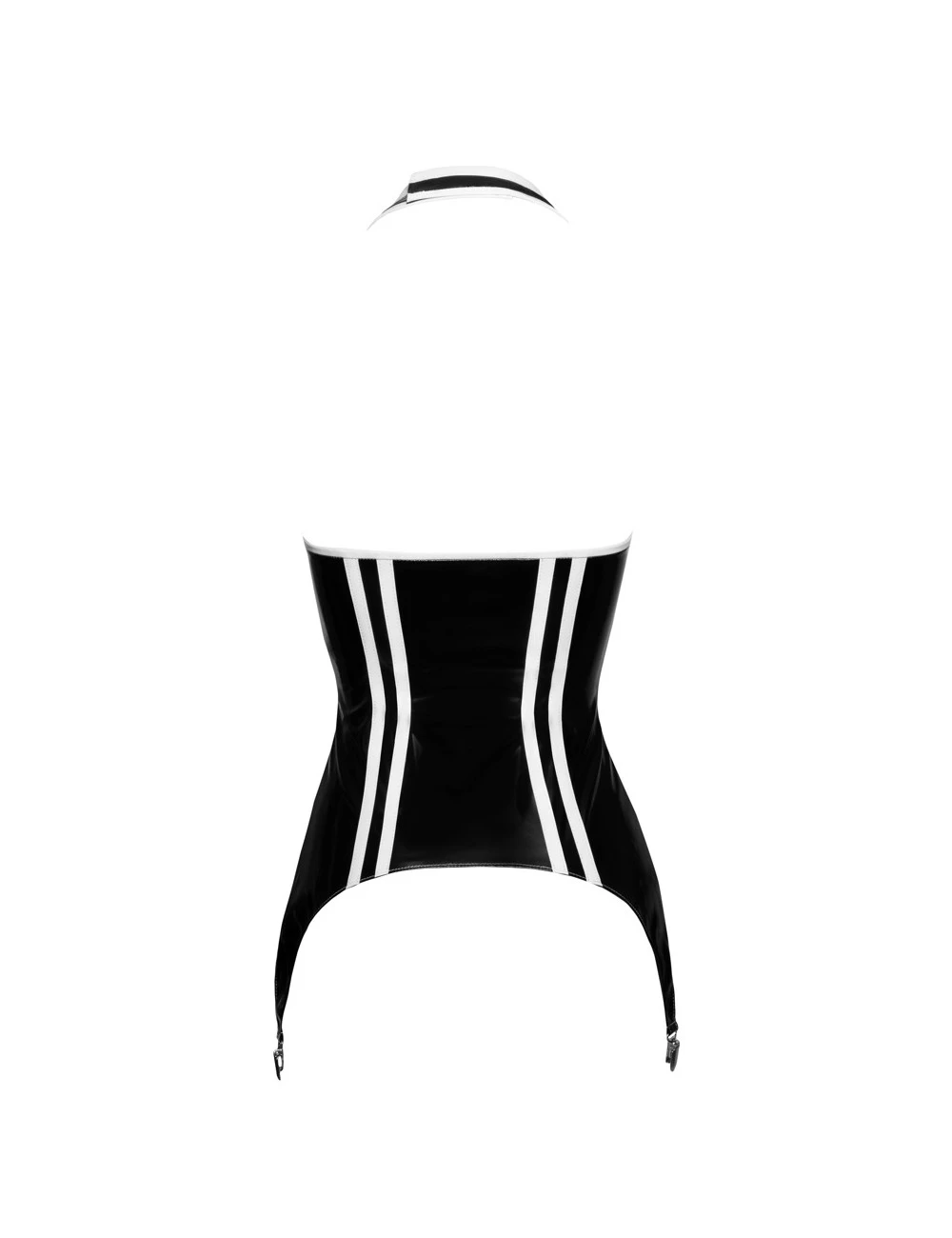 Sensationnel porte-jarretelles de Black Level dans un noir laqué brillant avec des passements et des rayures blanches laquées.