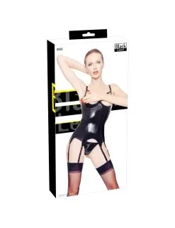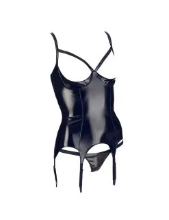 Guêpière vinyle noir brillant totalement ouvert sur la poitrine.