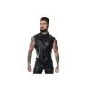 Guêpière noire en bi matière confectionnée avec empiècements de dentelle florale et wetlook avec un tissu doux à l’intérieur.