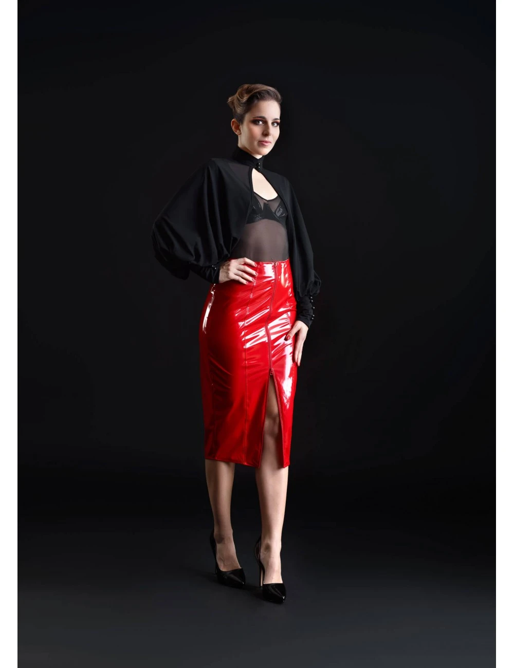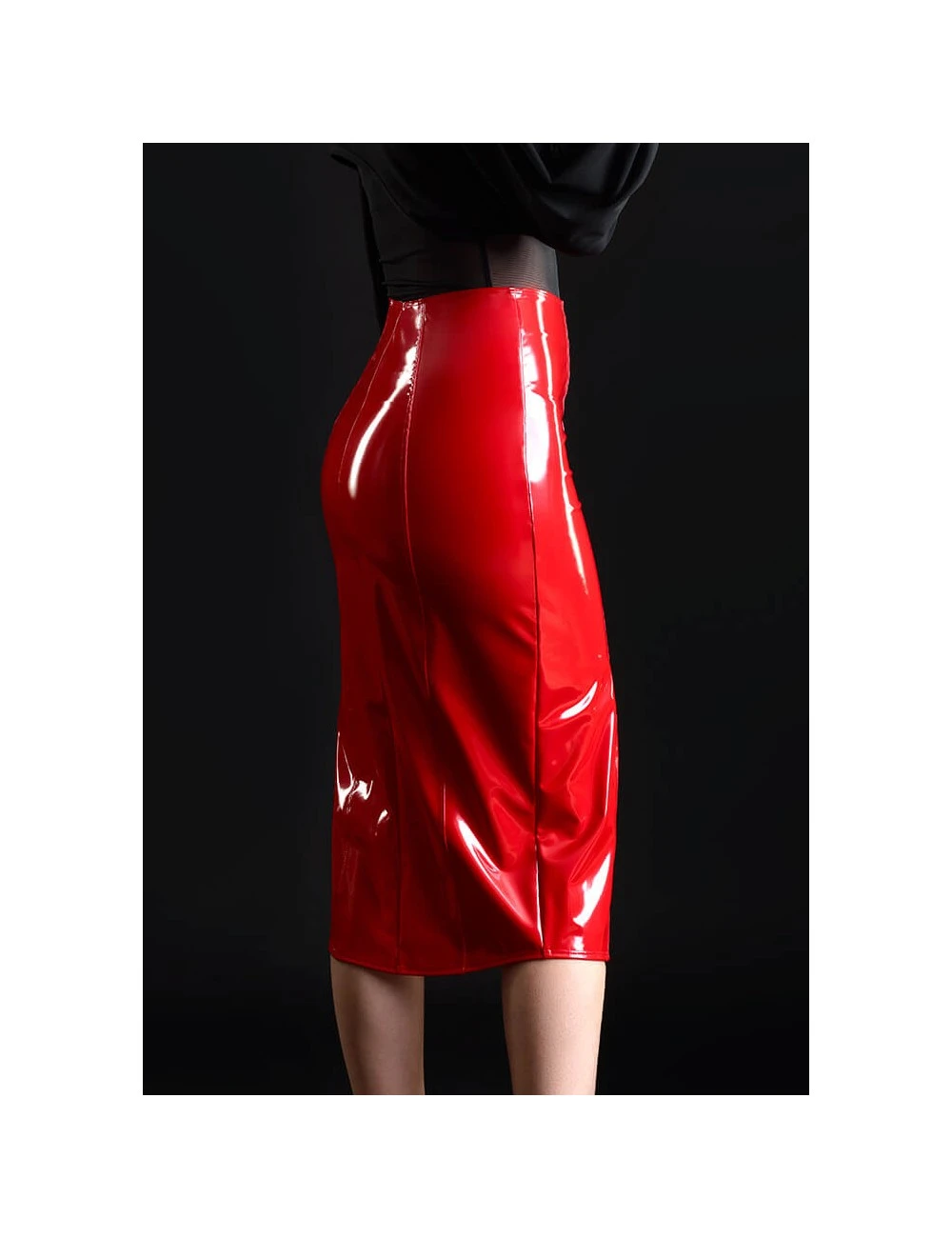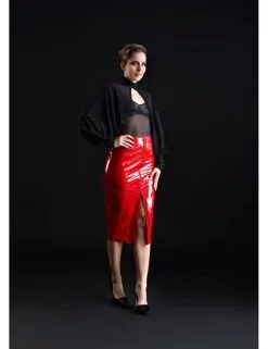 Jupe longue en vinyle rouge brillant extensible coupe crayon.