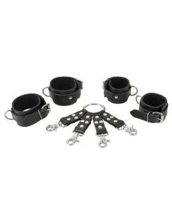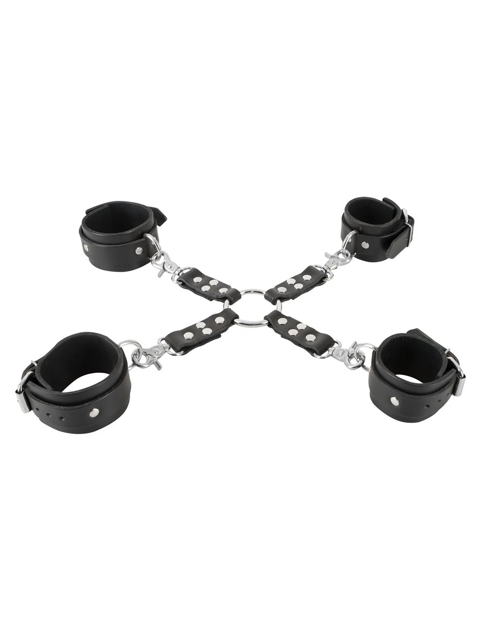 Kit attache bondage en forme de croix fait en cuir noir de qualité.