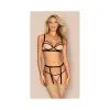 Alliance parfaite de confort et de dĂ©tails sĂ©duisants. DĂ©colletĂ© en V relevĂ© par la dentelle qui se prolonge de part et d’autre du ventre. Lanières attrayantes sortant du creux de la poitrine. A l’arrière, la coupe du corset dĂ©voile le bas du dos et finit en pointe sur de fins porte-jarretelles. Toutes les bretelles sont ajustables. Culotte assortie de dentelle et de lanières, ornĂ©e d’un mĂ©daillon en son centre.