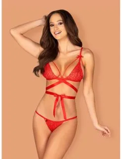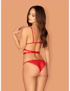 Un bel ensemble lingerie composé de 2 pièces assorties confectionné en dentelle rouge avec motif graphique.