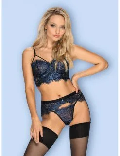 Cet ensemble lingerie marie incroyablement bien le noir avec le bleu ! Découvrez cette combinaison de couleur avec une dentelle transparente sur fond noir et ses motifs floraux bleus.