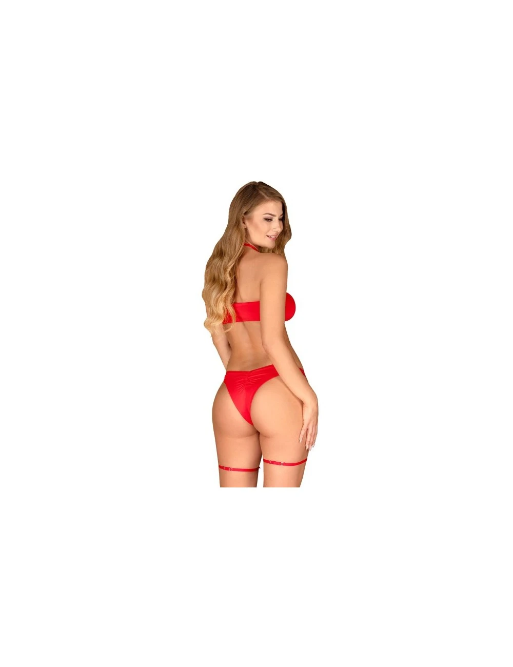 L’ensemble comprend: soutien-gorge pour un décolleté de toute beauté, un tanga assorti délicat, un tour de cou avec pendentif et deux jarretières avec petits noeuds.