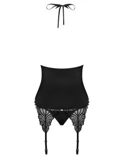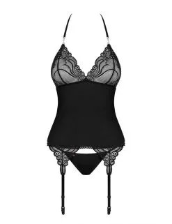 Un modèle de guêpière noire design faite d’empiècements de dentelle transparente sublimée de motifs et tissu uni doux.