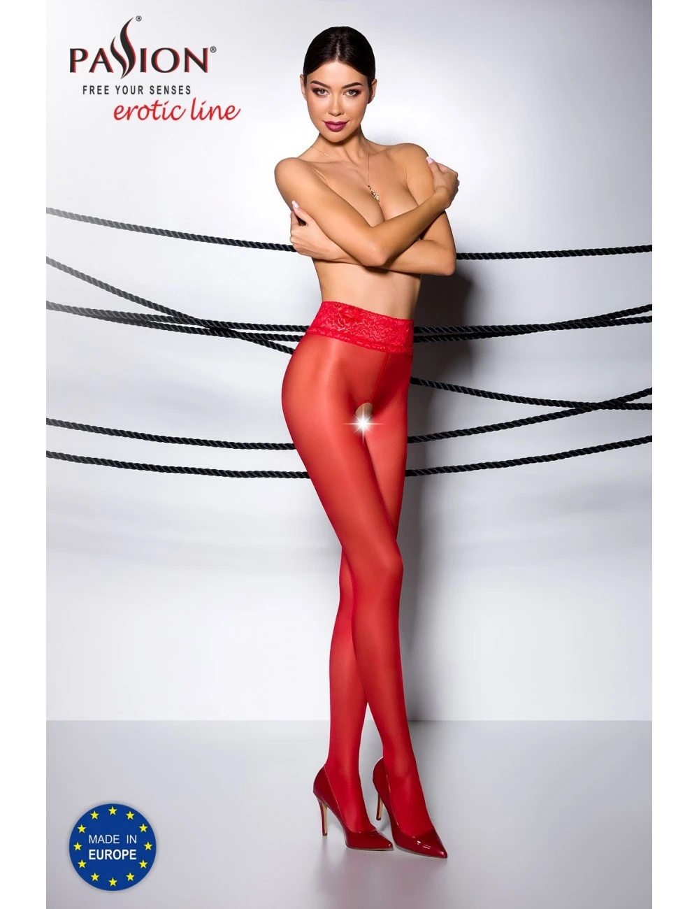 Collants rouge ouvert au niveau de l’entrejambe avec une belle finition en dentelle au niveau de la taille.