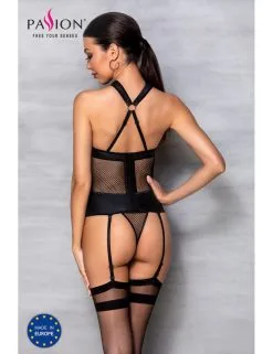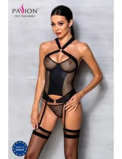 Guêpière en résille et empiècement en cuir noir avec string et jarretelles.