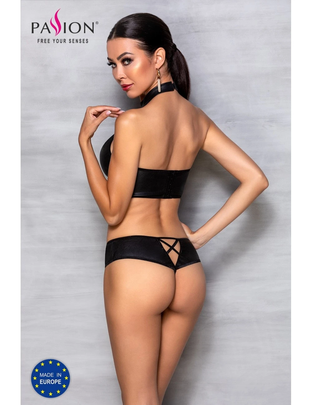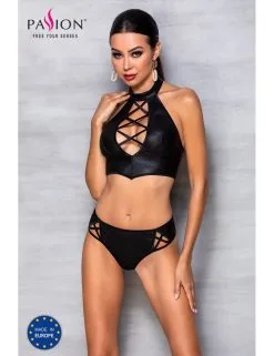 Un ensemble en similicuir dont les nombreuses applications de lanières croisées révèlent ses qualités féminines.