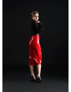Jupe longue en vinyle rouge brillant extensible coupe crayon.